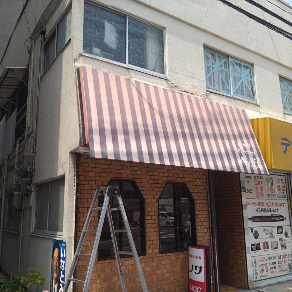 店先の固定テントの生地が破損したため、張替作業をさせて頂きました。